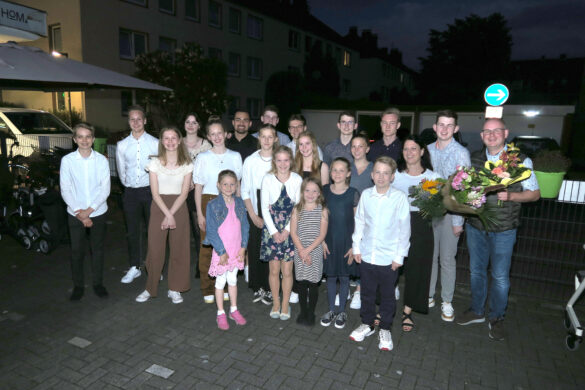 Dülmen. Eindrucksvolle und – bei den „dienstälteren“ Akteuren – sehr anspruchsvolle Klavier-, Trompeten- und Gesangsbeiträge von Schülerinnen und Schülern der Piano School Kitty Nagy klangen am Donnerstag über den Kundenparkplatz vom Fachgeschäft Homann, der für das Klassenvorspiel der privaten Musikschule zum Konzertareal hergerichtet worden war. Mit viel Applaus bedankte sich die Zuhörerschaft und gab insgesamt 1.045 Euro in den großen Spendensammelbehälter, die gestern Nachmittag an die Dülmener Ukraine-Hilfe übergeben wurden. Das Foto, das beim Schlussapplaus entstand, zeigt Gastgeber Bernd Homann (rechts) und die musikalischen Akteure des Abends: Carla, Martha, Greta und Jakob Sudmann, Klara, Johanna und Franziska Jessing, Julius Vordermark, Johanna Naber, Enie Vennemann, Johannes, Paul und Benedikt Homann, Anton Dura, Jesse Nitsche, Hannah Lennartz, Kalle Dieker, Liv Höhler, Moritz Hammer sowie Kitty Nagy.Foto: Reimund Menninghaus