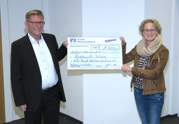 Dülmen. Seit langem unterstützt die VR-Bank Westmünsterland die Kulturarbeit der Stadtkapelle Dülmen mit 500 Euro jährlich. Zum 150-jährigen Jubiläum der Kapelle dieses Jahr überreichte VR-Bank-Verkaufsleiter Dirk Gärtner Montag eine Spende von 1.500 Euro an Maria Eggenkemper, Vorsitzende der Stadtkapelle. Verwendet werden soll das Geld für die Jubiläums-Aufwendungen: Samstag, 13. August, findet ein Festtag mit vielen Schützenvereinen und Musikgruppen statt – mit Treff aller Teilnehmenden am Annette-Gymnasium und Umzug durch die Stadt in den Wildpark, wo abends im Festzelt mit Musik vom DJ ein Fest für die ganze Bevölkerung stattfindet. Ebenfalls Bestandteile des Jubiläumsprogramms: Die musikalische Gestaltung des Auftakts des Dülmener Sommers mit einem Konzert am Samstag, 2. Juli, und das Jubiläums-Weihnachtskonzert am dritten Adventssonntag, 11. Dezember. Weitere Instrumentalisten sind den 45 Musikern stets willkommen.