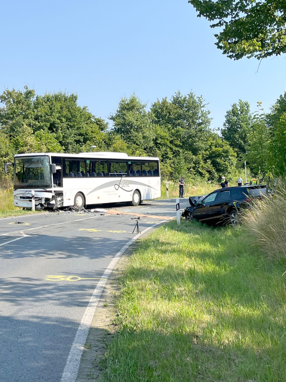 Dülmen. Ein Großaufgebot an Rettungskräften war am Donnerstag (27.06.24) an der Lüdinghauser Straße im Einsatz. Gegen 7.30 Uhr befuhr nach ersten Erkenntnissen eine 52-jährige Autofahrerin aus Dülmen die Straße aus Richtung B474 kommend. Kurz vor der Bahnunterführung „Lange Nase“ geriet sie aus bislang ungeklärten Gründen in den Gegenverkehr und kollidierte mit einem Schulbus. Bei dem Unfall verletzte sich die Autofahrerin schwer, zwischenzeitlich bestand Lebensgefahr. Ein Rettungshubschrauber flog sie in ein Krankenhaus.