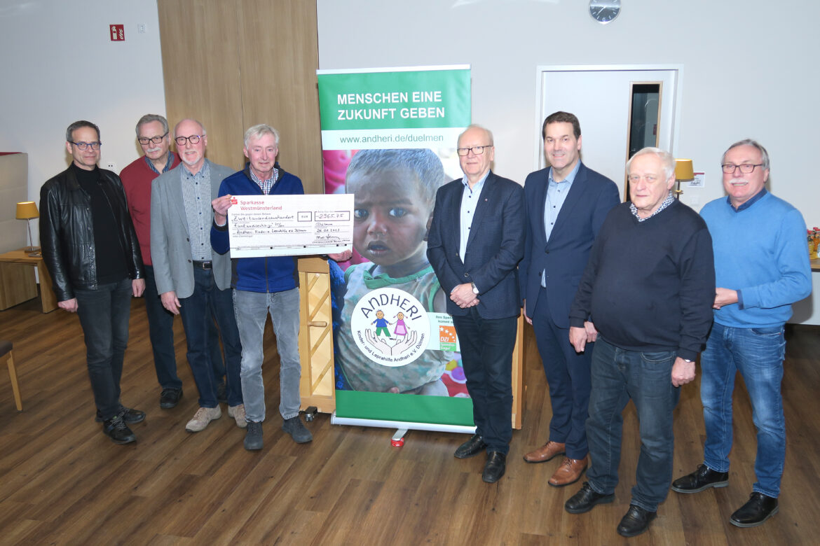 Dülmen. 2.965,75 Euro ist der Reinerlös des Konzerts „Friedensvision“ der Chorgemeinschaft Dülmen (kurz: CD), das am 8. Januar in der Heilig-Kreuz-Kirche stattfand. Am Donnerstag vor seiner Probe im Maria-Ludwig-Stift überreichte der Chor diese Summe als Spende an Bernd Schmitz, der das Geld im Namen der Andheri – Kinder- und Leprahilfe Dülmen e. V. dankbar entgegen nahm. Schmitz hatte bei dem Konzert auch als Tenor-Chorsänger und -Solist mitgewirkt. CD-Vorsitzender Klaus Demes dankte allen Sponsoren und Unterstützern des Chors – nicht zuletzt Schirmherr Rudolph Herzog von Croÿ, Kirchengemeinde Heilig Kreuz, Stadt Dülmen, VR-Bank Westmünsterland und Sparkasse Westmünsterland, die am Donnerstag vertreten war durch Regionaldirektor Christoph Schrey. Das Foto zeigt von links Bernd Dankbar (Schriftführer CD), Alfred Wortmann (Beisitzer CD), Klaus Demes (Vorsitzender CD), Wolfgang Schmitz (stellv. Vorsitzender CD), Bernd Schmitz (Andheri – Kinder- und Leprahilfe Dülmen), Christoph Schrey (Sparkasse Westmünsterland), Siegfried Werlein (Kassenführer CD) und Theo Cortner (Chorleiter CD) Foto: Reimund Menninghaus