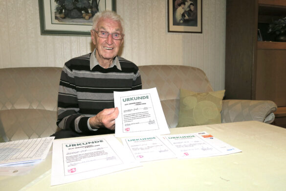 Aktuell hat Josef Kübelbäck für sein 33. Sportabzeichen in Gold die Disziplinen absolviert: beispielsweise 90 Zentimeter Hochsprung, 1,68 Meter Weitsprung aus dem Stand, 20 Kilometer Fahrradfahren in 60 Minuten, 8 Meter Medizinballwerfen, 50 Meter Sprint. Die Schwimmprüfung, die er mal ablegte, ist noch gültig – sie gilt für fünf Jahre. „Hat alles geklappt“, freut sich Josef Kübelbäck, der auch aus seiner Familie Unterstützung erfährt. „Allerdings sagt meine Frau Marianne immer: ,Sei vorsichtig.‘ Aber das bin ich ja auch“, meint der 89einhalbjährige mit einem Lächeln.