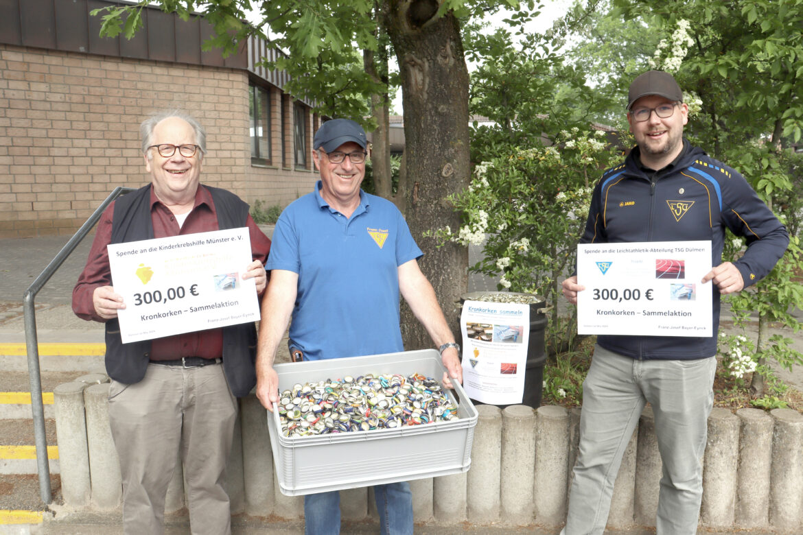 Dülmen (as). Was als fixe Idee startete (und zwischendurch sogar verworfen wurde), hat nun erste Früchte getragen: Franz-Josef Bayer-Eyncks Kronkorken-Sammelaktion führte zur Übergabe der ersten 2,3 Tonnen Kronkorken an die Firma Remondis – und zur Übergabe der ersten Spenden.