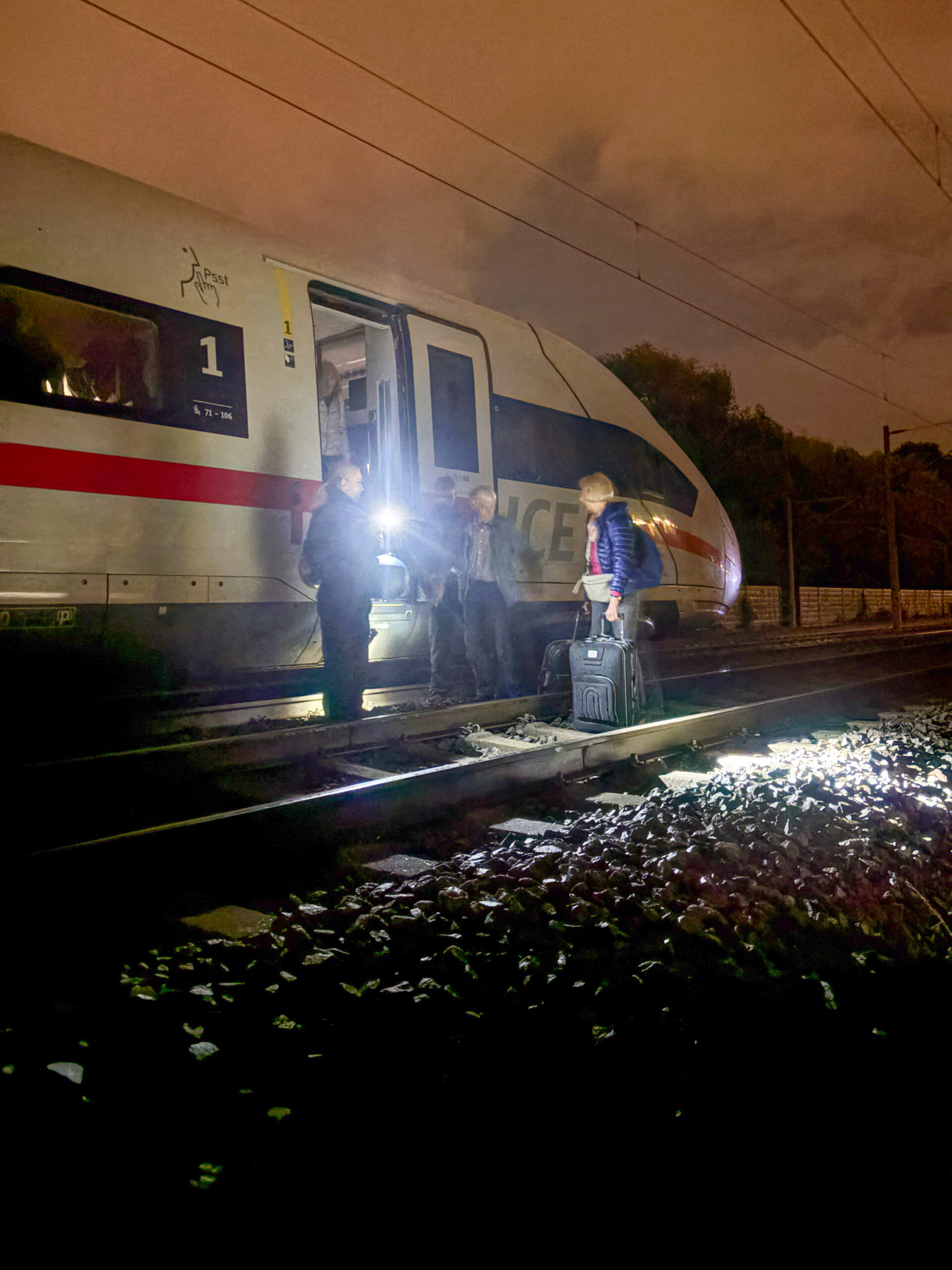 Die Passagiere, teils stark alkoholisiert, aber auch ihren Drang zum Rauchen hatten, wurden immer ungeduldiger. Hinhaltetaktiken der Bahn ließ die Nacht immer weiter voranschreiten. „So ,jetzt geht’s los“, ließ Hoffnung aufkommen. Die Türen wurden geschlossen. „Wir müssen Sie jetzt schulen“, sagte der Zugchef und das Protokoll abarbeiten. Wir sind ja schließlich in Deutschland. Die Batterie des Zuges müsste komplett abgeschaltet werden, damit der Zug abgeschleppt werden könne. Es war nun stockduster im Zug, die Kommunikation über die Lautsprecher war damit auch zu Ende. Nur noch Handylichter waren zu sehen. Dann passierte aber wieder rund 30 Minuten nichts. Die Uhr zeigte inzwischen 2 Uhr. Ein Notarzteinsatz folgte nun dem Nächsten. Die Luft wurde immer stickiger. Auch Ärzte an Bord halfen so gut es ging. Polizeiautos rasten heran. Es ging nicht weiter. Dann liefen Passagieren samt Gepäck über die Gleise. Die hatten die Notentrieglung der Türen betätigt und wollten die Heimreise zu Fuß antreten. Damit war klar, der Zug wird keinen Meter mehr machen. Die Bundespolizei versuchte diese „Flüchtigen“ noch einzufangen. Es wurden aber immer mehr. Dann entschied sich die Polizei alle Türen von außen zu entriegeln und die Passagiere nach und nach zu evakuieren.