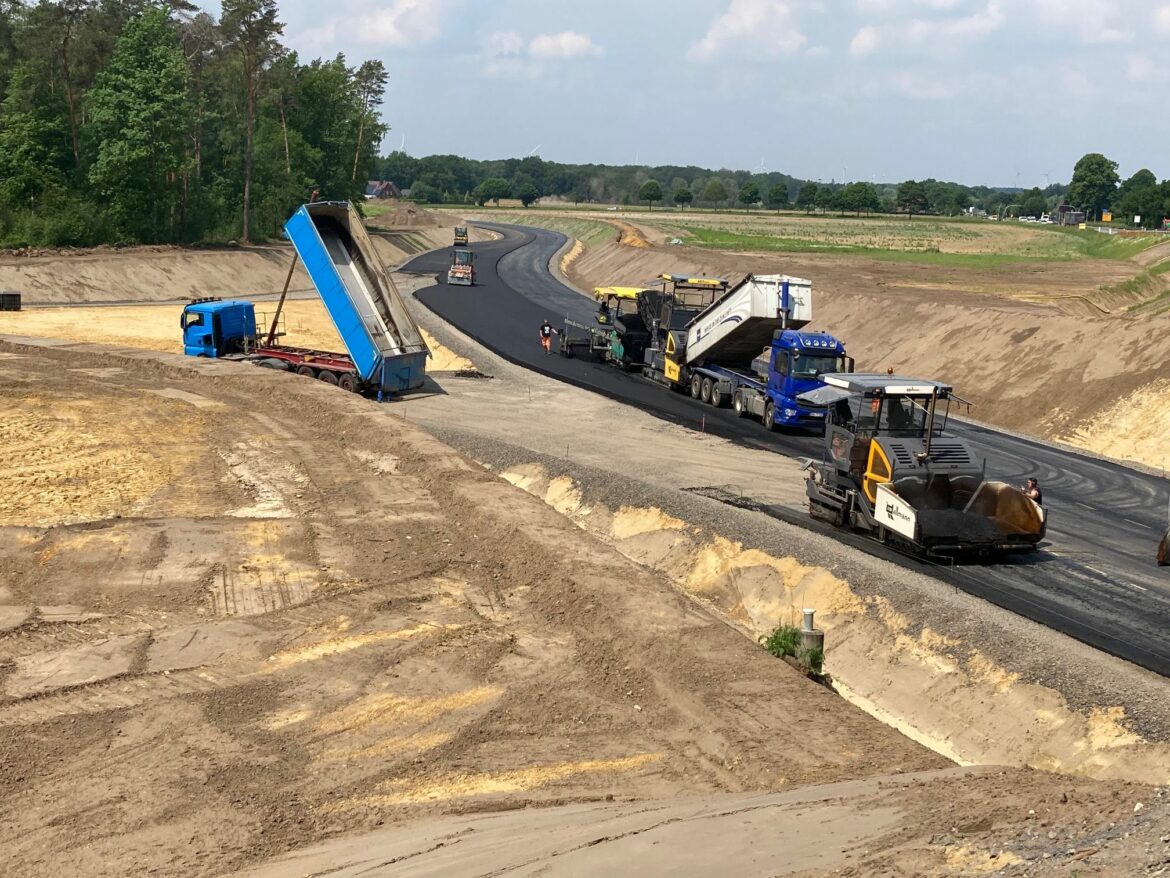 Es ist ein echter Meilenstein in der Geschichte der neuen B67 zwischen Reken und Dülmen. Seit der vergangenen Woche laufen im ersten Bauabschnitt die Asphaltierarbeiten und geben der neuen Straße ein Gesicht. 80 bis 90 LKW-Lieferungen Asphalt kommen täglich an, damit der Fertiger nicht stillsteht. „Wir arbeiten in einem zweilagigen Verfahren, denn die Straße soll später einer hohen Dauerbelastung Stand halten“, berichtet Dominik Schuurmann von der Straßen-NRW-Regionalniederlassung Münsterland, der den Neubau der Bundesstraße im Projektteam begleitet. Täglich wird die Qualität des Asphalts beprobt. Schon jetzt ist die Straße „schwarz“, aber die eigentliche Deckschicht wird erst ganz zum Schluss aufgebracht. Aktuell entsteht die Tragschicht, in zwei bis drei Wochen folgt die Binderschicht.