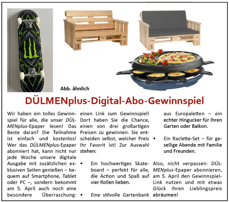 Teilnahmebedingungen: An der Verlosung dürfen alle registrierten Nutzer des DÜLMENplus-Digital-Abos ab 16 Jahren teilnehmen, deren erster Wohnsitz im Kreis Coesfeld ist. Die Gewinner werden per E-Mail von uns informiert. Um an der Verlosung teilzunehmen, müssen Sie sich lediglich bis zum 10.04.2025 um 12.00 Uhr das obenstehende Formular ausgefüllt haben. Der Veranstalter behält sich das Recht vor, nach eigenem Ermessen beliebige Teilnehmende ohne vorherige Benachrichtigung des Teilnehmers aus der Datenbank zu entfernen bzw. zu disqualifizieren. Der Verlag behält sich ebenfalls das Recht vor, das Gewinnspiel anzupassen, zu ändern oder abzubrechen, falls die Notwendigkeit besteht. Alle Angaben ohne Gewähr. Änderungen vorbehalten. Die Gewinner werden durch die zufällige Ziehung unter allen Teilnehmern, die sich rechtzeitig registriert haben, ermittelt und von uns per E-Mail über den Gewinn informiert. Mit der Teilnahme am Gewinnspiel willigen Sie in die Erhebung und Verwendung Ihrer E-Mail-Adresse ein. Der Rechtsweg ist ausgeschlossen. Eine Barauszahlung kann nicht erfolgen. Eine Weitergabe der Daten an Dritte findet nicht statt. Sie können die Einwilligungen jederzeit durch Nachricht an uns widerrufen. Ihre Daten werden anschließend gelöscht. Der Weiterverkauf ist strengstens untersagt.
