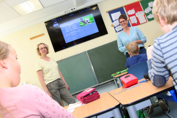 Schulleiterin Sabine Schäfer (r.) und Klassenlehrerin Petra Krevert (l.) setzen die neuen Smart-TVs schon im Unterricht ein – hier bei einer Stunde in der 3a. (Foto: Stadt Dülmen / Siemes)
