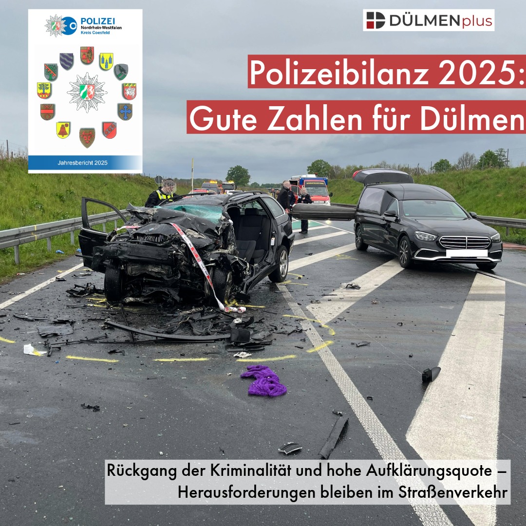 So positiv die Entwicklung in vielen Bereichen ist, zeigt ein Blick auf den Straßenverkehr eine andere Realität. Im Jahr 2025 kamen im Kreis Coesfeld – und damit auch im Umfeld von Dülmen – 12 Menschen bei Verkehrsunfällen ums Leben, 157 wurden schwer und 780 leicht verletzt. Hinter diesen Zahlen stehen menschliche Schicksale, die oft vermeidbar gewesen wären. Deshalb setzt die Polizei weiterhin einen klaren Schwerpunkt auf Verkehrssicherheitsarbeit, insbesondere bei Zweiradfahrern und im Umgang mit neuen Verkehrsmitteln wie E-Scootern.