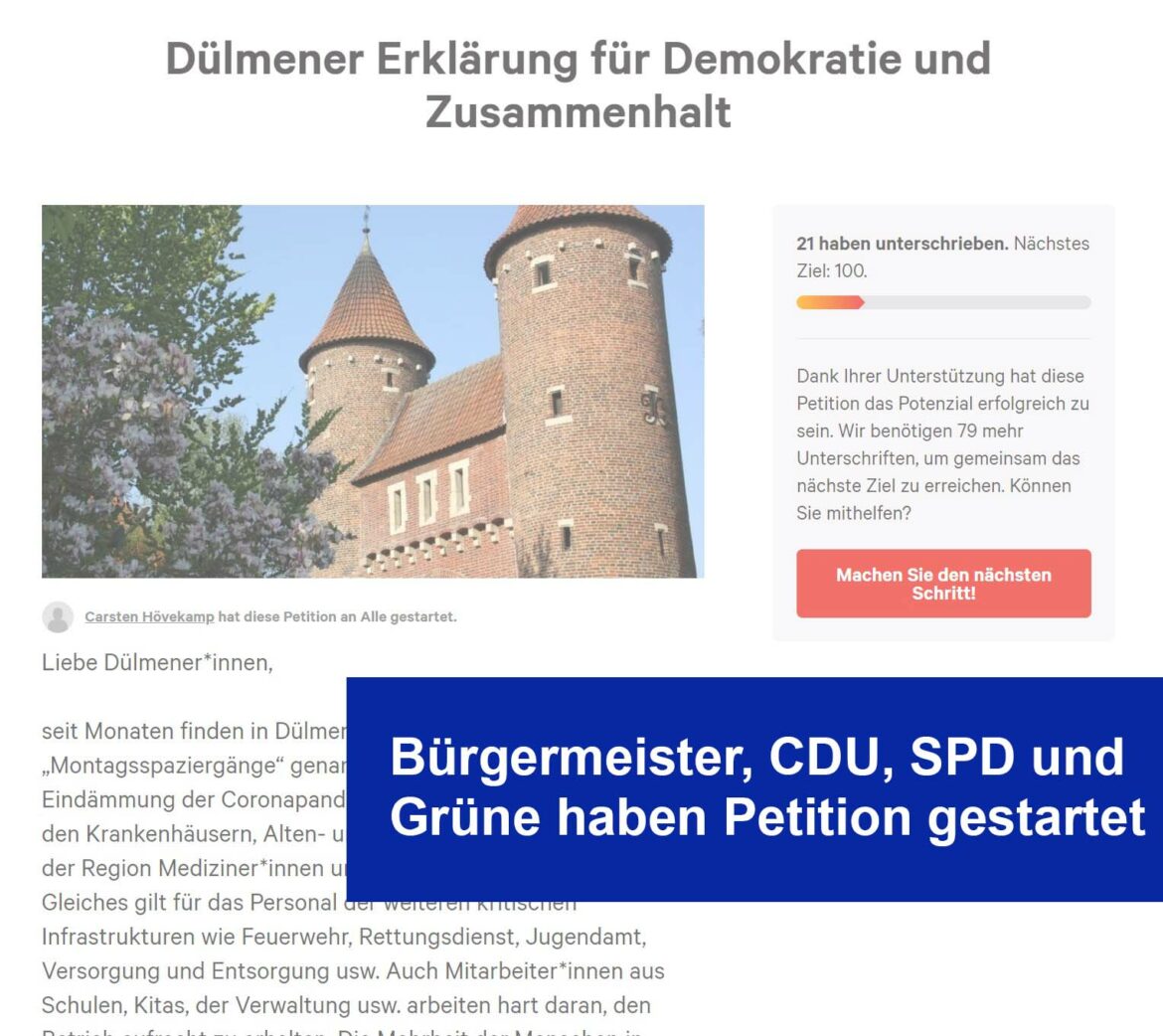 Dülmen. Gemeinsam mit den Fraktionen und Stadtverbänden von CDU, SPD und Bündnis 90/Die Grünen hat Bürgermeister Carsten Hövekamp heute die „Dülmener Erklärung für Demokratie und Zusammenhalt“ unterzeichnet. Sie soll ein Zeichen setzen für die Corona-Impfung, für Solidarität und gemeinschaftliches Miteinander und gegen die wöchentlich stattfindenden Montagsdemonstrationen. Bürgerinnen und Bürger können auf dem Internetportal www.change.org (Direktlink: www.change.org/DülmenerErklärung) die Petition unterstützen und digital unterzeichnen.