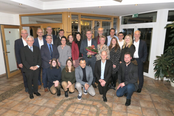 Buldern. Sein ganzes, insgesamt 46,5 Jahre währendes Berufsleben widmete Helmut Kreuznacht (Mitte, mit Blumen) der Volksbank in Buldern. Kurz vor Weihnachten bedankten sich seine aktuellen und ehemaligen Kolleginnen und Kollegen aus der Volksbank in Buldern sowie die drei Vorstandsmitglieder der Volksbank Nottuln im Rahmen eines gemeinsamen Essens im „Haus Waldfrieden“ für seine langjährige Treue zur Volksbank in Buldern. Die musste Helmut Kreuznacht alle Jahrzehnte über von zu Hause in Merfeld aus anpendeln. „Beim Einstellungsgespräch 1977 meinte Helmut Kreuznacht zu mir, dass ja in absehbarer Zeit die neue Umgehungsstraße bei Merfeld fertig sei und die Fahrt nach Buldern damit ja schneller würde“, schmunzelte Bernhard Lammers (vorne links) am Rande des Abends. Jetzt, wo Helmut Kreuznacht zu Beginn 2024 in seine passive Altersteilzeit gestartet ist, wird die besagte Straße endlich in absehbarer Zeit tatsächlich Wirklichkeit. Martin Herding (links), Vorstandssprecher der Volksbank Nottuln, würdigte in einer Laudatio die Verdienste von Helmut Kreuznacht, der sich seinerzeits sichtlich innerlich bewegt für die Zusammenarbeit bedankte: „Dass ich ein wunderbares Team in Buldern habe und hatte – das kann ich gar nicht oft genug sagen. Ihr werdet mir fehlen“ sagte Helmut Kreuznacht. Sven Steingräber (vorne stehend, Zweiter von links), Nachfolger von Helmut Kreuznacht in der Niederlassungsleitung der Volksbank in Buldern und Vorsitzender des Betriebsrats der Volksbank Nottuln, versicherte: „Wir werden Dich in bester Erinnerung haben!“
