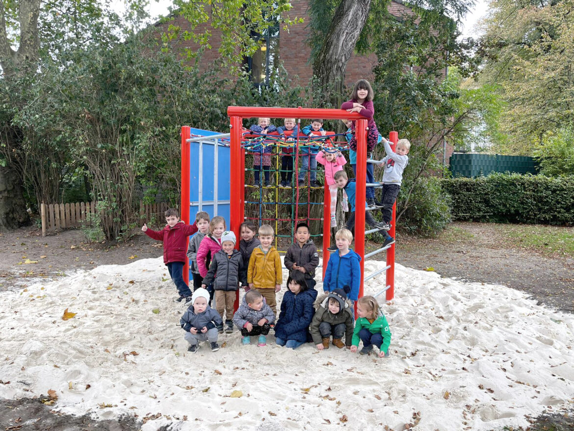 Im Familienzentrum Heilig Kreuz in Dülmen ist es dank vieler engagierter Väter gelungen, die Vor- und Nacharbeiten für ein neues Klettergerüst auszuführen. Als Vorarbeit musste ein Kreis von sieben Metern Durchmessern und 30 Zentimetern Tiefe ausgehoben werden, danach wurde das neue Klettergerüst von einer Fachfirma angeliefert, aufgebaut und einbetoniert. Nachdem der Beton ausgehärtet war, haben die Väter mit einem kostenlos geliehenen Trecker-Anhänger-Gespann der Firma Bodenverwertung Brinkmöller 20 Tonnen gespendeten Sand bei den Quarzwerken Haltern abgeholt. Nun wurde in Schwerstarbeit der Sand zum Klettergerüst geschafft und eingeschaufelt. Der übrig gebliebene Sand konnte auf die Sandkästen verteilt werden.