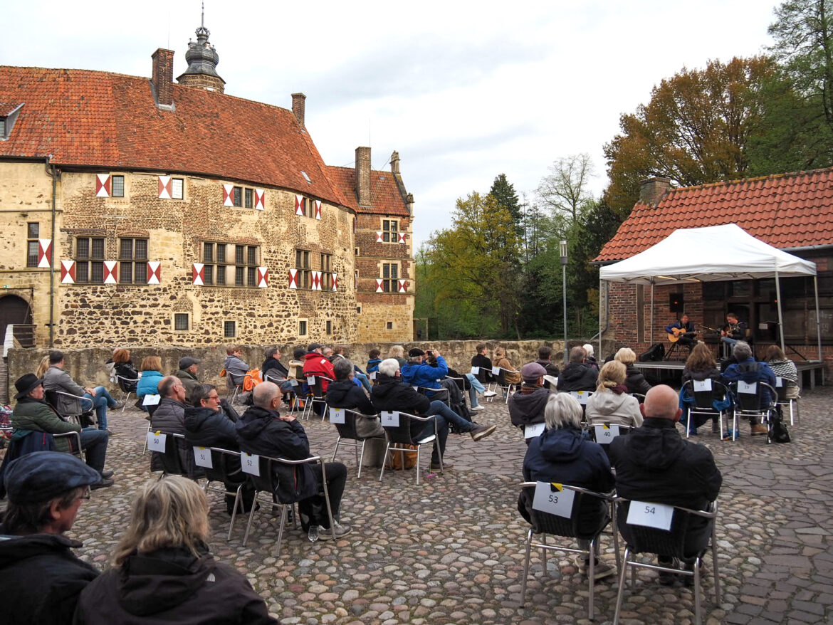 Einige abendliche Passanten schauten eher ungläubig in Richtung Burg Vischering, als am Samstag die ersten Konzertklänge zu hören waren: Mit dem Auftakt der dreiteiligen Reihe „MaiKlang“ fand die lange Pause kultureller Veranstaltungen auf dem Burggelände in Lüdinghausen ein Ende. Unter strengen Hygieneauflagen konnten die Zuschauer das Open-Air-Event live genießen. „Wir bräuchten neben Ihren Konzertkarten bitte einmal den Nachweis Ihres negativen Corona-Tests oder einer Immunisierung und einen Lichtbildausweis“, so die Worte der Mitarbeiterinnen am Einlass vor der Gräftenbrücke. „Wir haben Sie vermisst“, mit diesen Worten eröffnete Kulturdezernent Detlef Schütt sichtlich erfreut die restlos ausverkaufte Veranstaltung. Einhundert Konzertbesucher waren anwesend. Zur Freude derjenigen, die kein Ticket ergattern konnten, übertrug das WDR-Fernsehen das Konzert über eine TV-Live-Schaltung. Auch die folgenden MaiKlang-Konzerte am vierten und fünften Maiwochenende sind bereits ausgebucht. Der Kartenverkauf für Tickets im Juni läuft komplett online über den Ticketanbieter Reservix beziehungsweise auf www.burg-vischering.de.