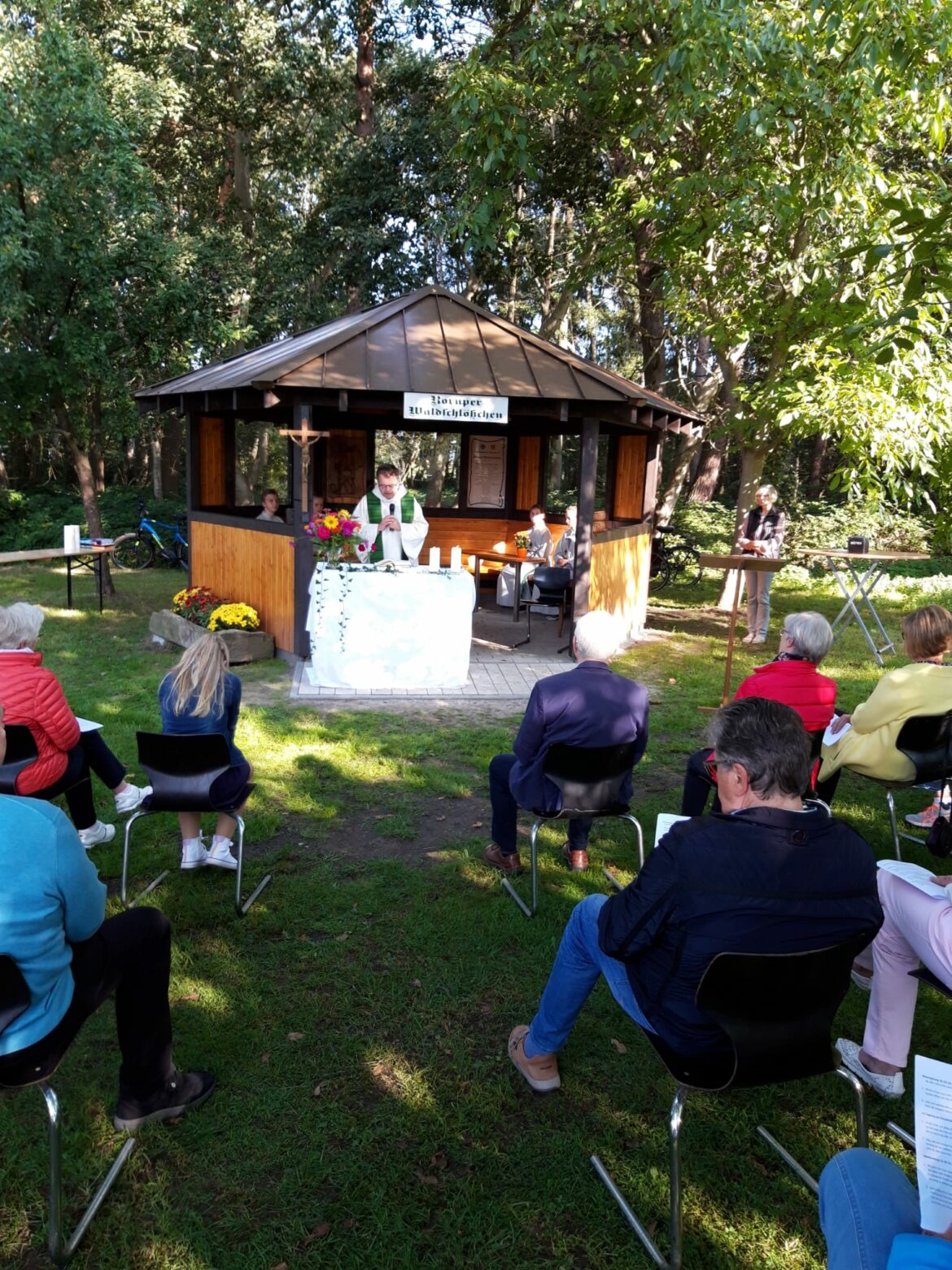 Sehr gut besucht war zu Beginn der Feierlichkeiten bereits die hl. Messen, die im Freien von Pfarrer Heio Weishaupt zelebriert wurde. Im Rahmen der Einsegnung der Wetterschutzhütte bat der Geistliche um Schutz vor Schäden durch Wasser, Sturm und Gewitter für das neue Ziel für Wanderer und Radwandere im Ortsteil Rorup.