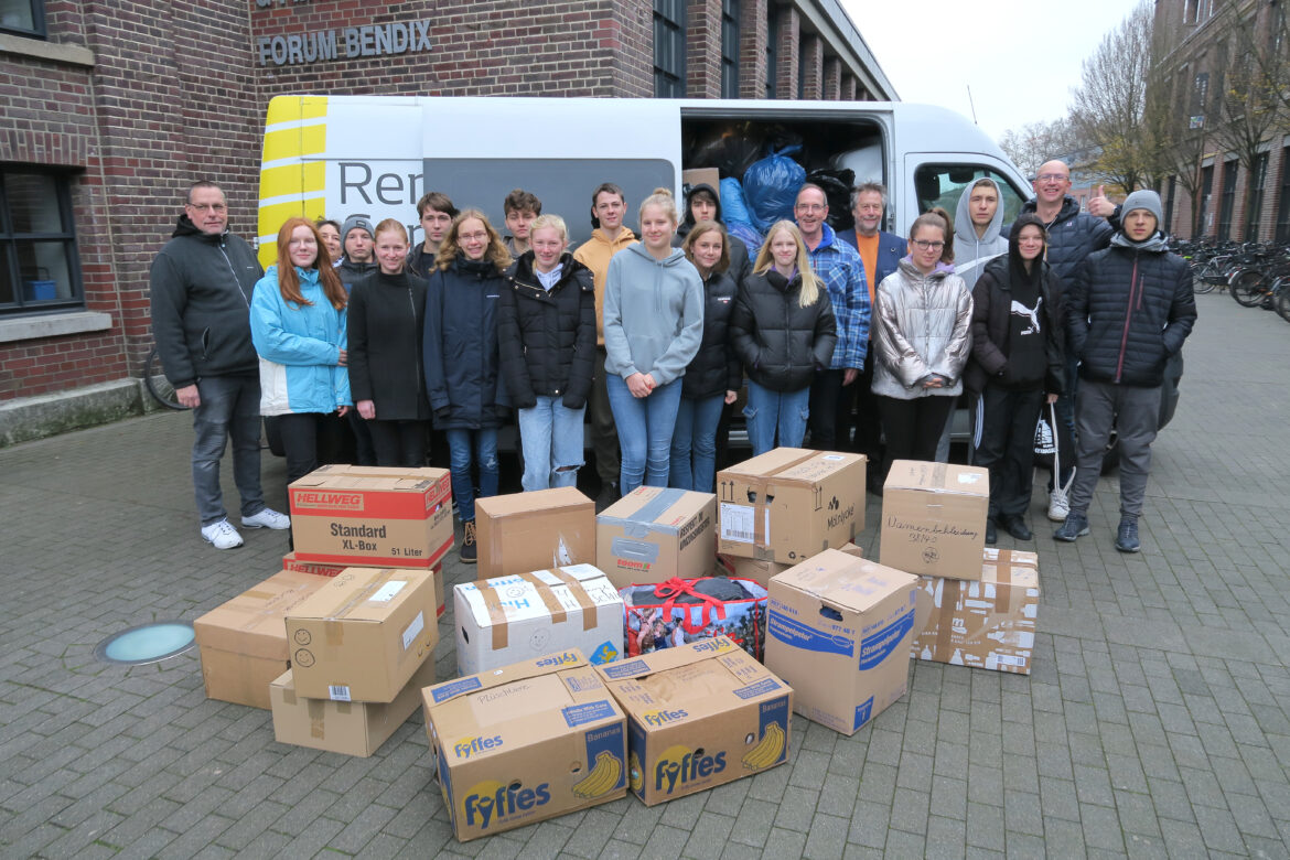 Der Arzt Dr. Ralf-Peter Oelsner, Vorsitzender der „Lüneburger Hilfsprojekt Ukraine e. V.“, und einer seiner Mitstreiter, Zahntechnikermeister Thomas Erler, kamen dazu mit einem Transporter nach Dülmen, und Schüler aus der Schülervertretung (SV) packten die gesammelten Hilfsgüter in das Fahrzeug. Unter ihnen auch einige der 31 aus der Ukraine geflüchtete Schülerinnen und Schüler, die am AvDHG unterrichtet werden. Für sie und ihre Familien war ursprünglich in der Schule gesammelt worden. Weil der Platz in dem Transporter nicht ausreichte, organisierte SV-Lehrer Christian Stock über die Spedition Moll ein weiteres Transportfahrzeug, so dass alle Hilfsgüter auf den Weg gebracht werden konnten.