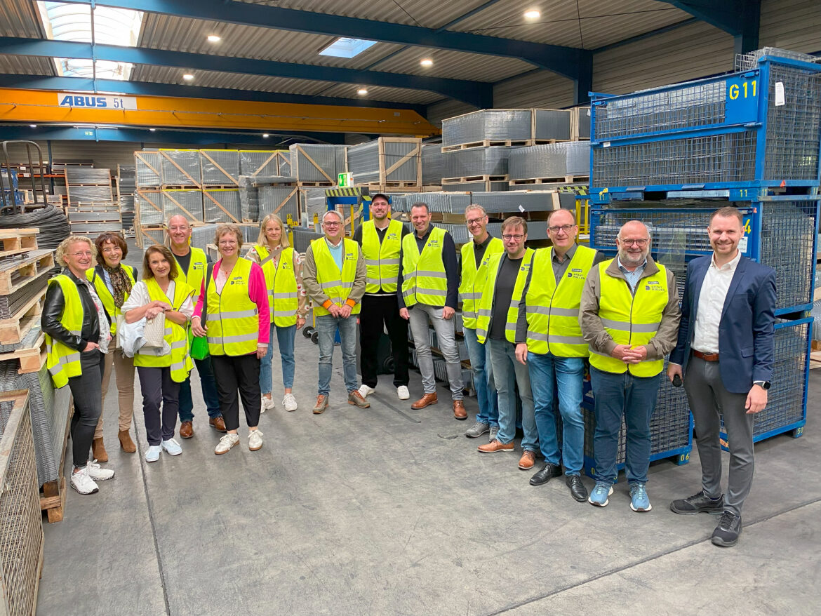 Wie werden aus Draht verschiedenster Dicke und unterschiedlicher Metalllegierungen Gitter, die in Regalsystemen, als Kabelkanal oder beispielsweise in der Landwirtschaft in der Tierhaltung eingesetzt werden? Das erfuhren die Teilnehmenden an einer Betriebsführung, zu der die Interessengemeinschaft Dülmener Unternehmen (IDU) e. V. ihre Mitglieder in die Firma Draht Müller am Baumschulenweg eingeladen hatte. Draht-Müller-Geschäftsführer Marcel Stender (rechts) führte die Gäste durch die Produktionshallen und gab Erläuterungen dazu. Am Ende des Rundgangs gab es Kaffee und belegte Brötchen. Und auch Grillwurst – die spendiert das Unternehmen seinen Mitarbeitern jeden Freitag zum Schichtwechsel. – Nächste Events bei der IDU sind die Dülmener Oktoberfeste am 4. und am 18. Oktober bei „An‘ Koppelsteen“, die IDU-Mitgliederversammlung am Donnerstag, 6. November, und das zehnte Eisstockschieß-Turnier „IDU-Krone“ am 4. Dezember auf der Eisbahn. Tickets/Anmeldung auf www.idu-duelmen.de. Weitere Infos auch auf dem IDU-WhatsApp-Kanal. Zu finden unter https://tinyurl.com/53tpda58.