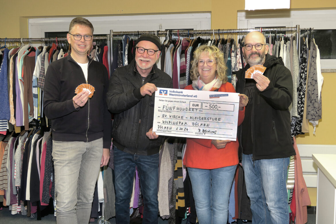 Jeden Dienstag von 15.30 bis 18 Uhr ist – außerhalb der Schulferien – im Keller der alten Paul-Gerhardt-Schule (Paul-Gerhardt-Str. 10) die Kleiderstube der Evangelischen Kirchengemeinde Dülmen geöffnet. Alle Interessenten können dort für Stückpreise von 1 bis 6 Euro gebrauchte Kleidung kaufen. Angeboten wird Ware, die aus der Bevölkerung bei der Kleiderstube abgegeben wird. Kleidung, die keine Abnehmer findet, holt die Kolpingsfamilie Dülmen ab und führt sie der Weiterverwendung bei Kolping Recycling zu. Zum Dank für diese gute Kooperation überreichten Jörg Czipull (links) und Ralf Alfschnieder (rechts) vom Vorstand der Kolpingsfamilie nun eine 500-Euro-Spende an (Mitte von links) Diakon Ralf Kernbach, bei der Kirchengemeinde Ansprechperson für die Kleiderstube, und Sylke Vöcking, Koordinatorin der beiden Kleiderstuben-Teams, die im 14-täglichen Wechsel im Einsatz sind. Zusätzlich übergaben die Kolpingvertreter für die Kleiderstuben-Teams auch 30 Gutscheine für jeweils drei Kolping-Reibekuchen, die in diesem Jahr am Sonntag, 10. November, von 11 bis 16 Uhr bei der Bäckerei Böckmann und freitags bis sonntags beim Dülmener Weihnachtsmarkt auf dem St.-Viktor-Kirchplatz angeboten werden. Ralf Kernbach und Sylke Vöcking bedankten sich für die Spende und die Gutscheine und sagten, sie würden sich im Namen der Kundinnen und Kunden der Kleiderstube freuen, wenn noch mehr auch „junge Mode“ als Sachspende bei der Kleiderstube abgegeben würde. Foto: Menninghaus