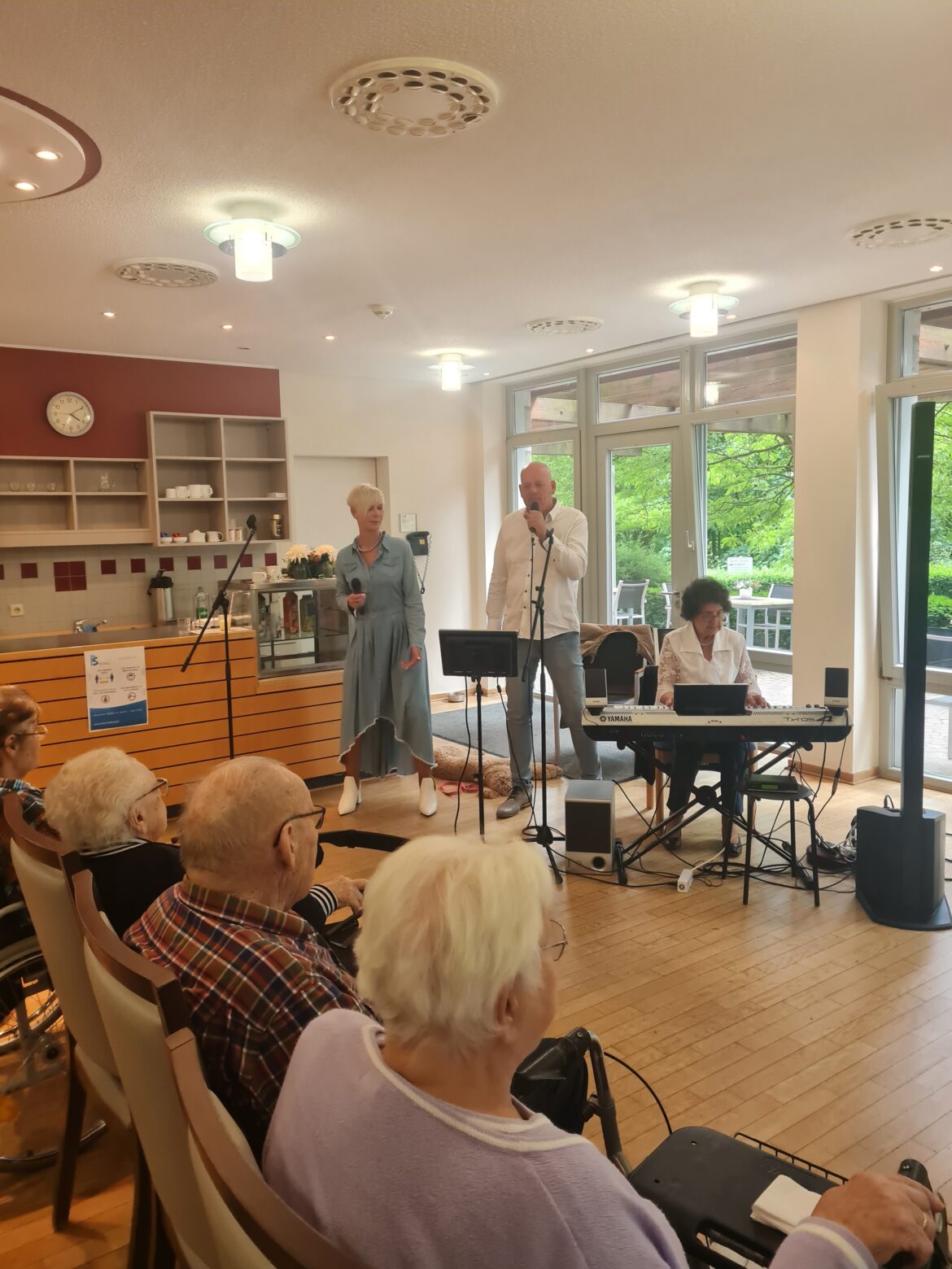 Dülmen. Am 25. Mai besuchte das Hitparadentrio, bestehend aus Manuela Zietlow, Waltraud Grespan und Reinhard van Loh, zum ersten Mal das Ev. Altenhilfezentrum. Bewohner und Mitarbeiter wurden von bunt gemischten Hits der letzten 40 Jahre wunderbar unterhalten, die das Trio mit Gesang und Keyboardbegleitung darbot. Die Lieder luden die Gäste zum Schunkeln ein, es wurde geklatscht und getanzt. Durstige Kehlen wurden mit einem „Sanften Engel“ erfrischt, sodass die Zuhörer stimmgewaltig mitsingen und auch noch eine Zugabe fordern konnten. Miss Marple, die tierische Begleitung des Trios, störte dies aber wenig – der Königspudel schaute sich entspannt das Treiben an und legte zwischendurch auch ein Nickerchen ein.