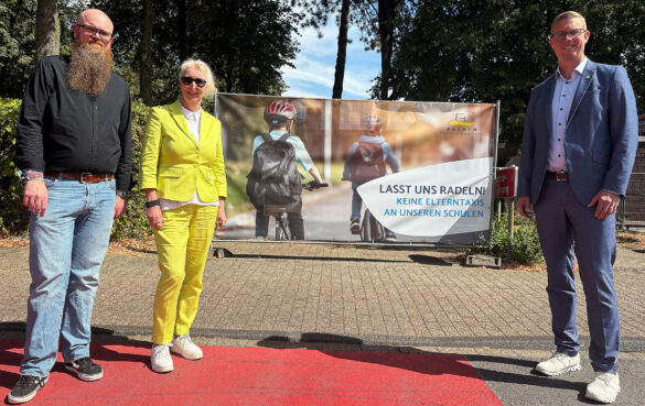 „Wenn Kinder regelmäßig mit dem Rad oder zu Fuß zur Schule kommen, entwickeln sie ein besseres Gespür für Verkehrssituationen und ihre Selbstständigkeit wird gestärkt. Zudem ist der Schulweg auch ein wichtiger Bestandteil des Schulalltags. Hier trifft man seine Freunde, redet über das letzte Fußballspiel und schmiedet gemeinsame Pläne“, sagt Bürgermeister Carsten Hövekamp. Deshalb hat die Stadt gemeinsam mit den Schulen die Plakatmotive entwickelt. Die Botschaft ist klar: „Keine Elterntaxis an unseren Schulen“. Die Banner wurden so platziert, dass sie an Straßen im Schulumfeld direkt ins Auge fallen – wie am Clemens-Brentano-Gymnasium. Schulleiterin Maike Verwey hat die Aktion von Beginn an unterstützt. „Es gibt natürlich Situationen, in denen Eltern auf das Auto angewiesen sind, um das Kind zur Schule zu bringen. Dann sollte man aber möglichst über Fahrgemeinschaften nachdenken und Haltepunkte in sicherer Entfernung zur Schule suchen“, erklärt Maike Verwey.