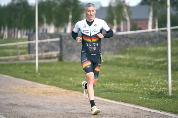 Der Duathlon in Alsdorf ist für die Triathlon-Szene Europas immer so etwas wie der Saisonauftakt. In diesem Jahr wurden auf der anspruchsvollen und welligen Strecke (10 Kilometer Laufen, 60 Kilometer Radfahren, 10 Kilometer Laufen) neben den Deutschen Meistern auch die Europameister der Profis sowie in den Altersklassen gesucht. „Der Startschuss bei kühlen und windigen zehn Grad war für uns um 8.45 Uhr“, so Rath. „Den ersten Lauf bin ich bewusst konservativ angegangen und nach 38:18 Minuten auf das Fahrrad gestiegen. Der wellige 20-Kilometer-Kurs mit vielen Wendepunkten war insgesamt dreimal zu durchfahren. Nach 1:28:47 Stunden fuhr ich mit der schnellsten Radzeit der Altersklasse (Schnitt 40,6 km/h) in die zweite Wechselzone. Erfahrungsgemäß folgte dann der knüppelharte zweite Lauf. Doch das Training scheint sehr gut angeschlagen zu haben, sodass ich ein sehr gutes Pacing durchziehen konnte und nur minimal langsamer als beim ersten Lauf nach 39:02 Minuten auf der Zielgeraden angekommen war. Nach insgesamt 2:48:41 Stunden überquerte ich sehr zufrieden die Ziellinie. Mehr als drei Minuten schneller als meine Bestzeit in Alsdorf. In der Wertung der Europameisterschaft belegte ich somit den 8. Platz. Bei der gleichzeitig ausgetragenen deutschen Meisterschaft den 5. Platz.“