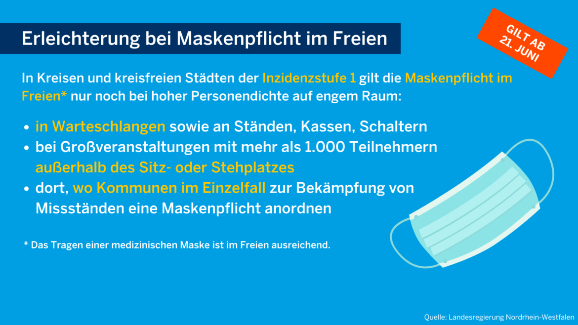 Kreis Coesfeld. Wichtige Neuerungen: Ab kommenden Montag (21.06.2021) entfällt in NRW die Maskenpflicht im Freien bis auf wenige Ausnahmen. So können dann Lehrkräfte und Lernende auch auf Schulhöfen die Masken wieder abnehmen. In Schulgebäuden und Klassenräumen gilt aber mindestens bis zu den Sommerferien weiterhin die Maskenpflicht.