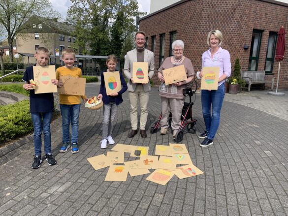 Dülmen. Ganz besondere Ostergrüße überbrachten jetzt Fabian, Leon und Lea gemeinsam mit ihrer Klassenlehrerin Susanne Reher der Heilig-Geist-Stiftung: Die 22 Jungen und Mädchen der Klasse 4 a der Mauritius Grundschule Hausdülmen hatten sich viele Gedanken darüber gemacht, wie sie den BewohnerInnen der Altenpflegeeinrichtung am Mühlenweg eine österliche Freude und ein Zeichen der Wertschätzung schenken könnten. Es wurde fleißig gemalt, gedichtet und geschrieben, viele liebe Worte, Gedanken und Wünsche wurden schließlich zu wunderbaren Kinder-Briefen. Stellvertretend für alle BewohnerInnen nahmen sie Maria Schupp, Vorsitzende des Bewohnerbeirats, Kerstin Brinkmöller, Pflegedienstleitung, und Stephan Chilla, Sozial-Pflegerischer Vorstand der Heilig-Geist-Stiftung, jetzt in Empfang. „Eine ganz besondere und liebevoll umgesetzte Idee von den Kindern, wir freuen uns riesig darüber“, so Stephan Chilla. „Die KollegInnen aus dem Sozialen Dienst werden alle Briefe entweder vorlesen oder beim Lesen unterstützen“, so Chilla. „Ihr macht uns wirklich eine ganz große Freude, das geht uns zu Herzen“, so auch Maria Schupp. Gerade in Zeiten, in denen durch Corona Abstand und Entfremdung unter den Generationen viel Raum eingenommen haben, freut man sich in der HGS umso mehr über so viel kindliches Engagement und Kreativität.