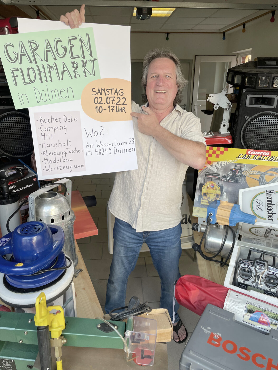 Dülmen. An diesem Samstag, 2. Juli, findet von 10 bis 17 Uhr am Wasserturm 23 ein privater Garagenflohmarkt von Michael Lechner statt. Eine Aktion, auf die er sich schon sehr freut: „Nach über sechs Jahrzehnten auf dieser schönen Erde hat sich einiges bei uns angesammelt. Da wir Männer ja als Jäger und Sammler bekannt sind und ich das Sammeln vielleicht etwas zu wörtlich genommen habe, ist es an der Zeit, sich von einigen Dingen zu trennen. Dazu gehören unter anderem Audio-, HiFi- und Gartengeräte, Modellbau, Deko, Kleidung, Werkzeug und vieles mehr… Am besten ist, wenn man einfach selber vorbeikommt und sich ein Bild macht.“
