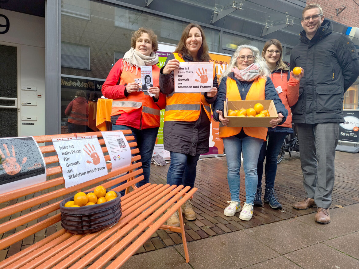 Dülmen. Mit Infostand und farbig passender Bank hat das Netzwerk Mädchen- und Frauenarbeit auf den morgigen „Orange Day“ aufmerksam gemacht: In der Marktstraße wurden zudem kostenlose Orangen verteilt. Der „Orange Day“ ist der Aktionstag zur Bekämpfung von Diskriminierung und Gewalt jeder Form gegenüber Frauen und Mädchen. Er findet jedes Jahr am 25. November statt. Bürgermeister Carsten Hövekamp dankte allen Teilnehmenden für die Aktion und für ihr Engagement. Gemeinsam unterstrichen Netzwerk-Mitglieder und Bürgermeister: „Hier ist kein Platz für Gewalt an Mädchen und Frauen“. Hintergrund: Hilfetelefon: Das Hilfetelefon „Gewalt gegen Frauen“ ist ein deutschlandweites Beratungsangebot für Frauen, die von Gewalt betroffen sind – sowie für Menschen aus dem sozialen Umfeld der Betroffenen und Fachkräfte. Unter der Telefonnummer 116 016 oder online unter www.hilfetelefon.de werden Betroffene kostenlos unterstützt, 365 Tage im Jahr rund um die Uhr in 18 Sprachen.