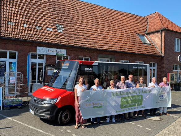 Merfeld. Den Bürgerbusverein Merfeld und Hausdülmen e. V. und den Dorfladen Merfeld gibt es inzwischen seit fünf Jahren. Dieses Jubiläum wird an diesem Samstag, 16. September, von 15 bis 20 Uhr im Merfelder von-Galen-Park zwischen Kirche und Grundschule mit einem bunten Fest gefeiert. An Tischen und Bänken kann man Kaffee, Kakao und Kuchen genießen, es gibt frische Waffeln, Currywurst, Leberkäse im Brötchen, Asia-Nudeln und diverse kalte Getränke. So beispielsweise Wein vom Winzer in der für Merfeld so bekannten Weinlaube. Während sich Mama und Papa und Oma und Opa auf diese Weise einen schönen Nachmittag machen können, sind die Kinder ebenfalls gut beschäftigt. Sie können sich auf der großen Hüpfburg der Feuerwehr Dülmen austoben und sich auch sonst die Zeit auf dem Spielplatz im von-Galen-Park und beim Kinderschminken vertreiben. Für Live-Musik sorgt ein Duo aus Lüdinghausen. Wer technisches Interesse hat, kann sich das neue in Merfeld stationierte Feuerwehrfahrzeug anschauen und erläutern lassen. Und auch der Bürgerbus, der montags bis freitags Merfeld und Hausdülmen mit Dülmen verbindet sowie innerhalb Dülmens regelmäßig Runden dreht, wird am Samstag zu begutachten sein. „Wir freuen uns auf viele Gäste“, hieß es Montag bei einem Pressegespräch, bei dem auch dieses Foto mit (von links) Melanie Bergmann, Rolf Barnutz, Katja Redlich, Willi Espeter, Heinz Mensmann, Gabriele Sondermann, Helmut Temming und Dr. Hugo Schulze Hobbeling entstand. Foto: men