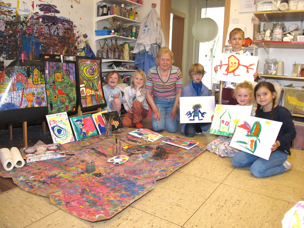 Beim Rundgang durch den Kindergarten können alle Besucherinnen und Besucher erleben, was die 65 Kinder in den drei Gruppen unter dem Eindruck der Werke von Friedensreich Hundertwasser gestaltet haben – sei es als Bilder auf Leinwand oder Papier, sei es als kreativ gearbeitete Objekte aus Schuhen oder sei es als Stadt en miniature aus Pappe, Papier und Farbe. Denn bereits seit einigen Wochen befassen sich die zwei- bis sechsjährigen Kinder mit Hundertwasser und seiner Kunst – im Bereich der Malerei, aber auch im Bereich der Architektur und Gebäudegestaltung.