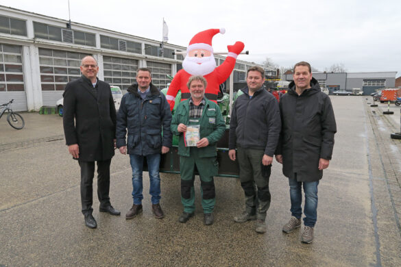Freude bei (von links) Thomas Reher, Vorsitzender der Behindertenhilfe Dülmen, Benedikt Wichmann, Mitorganisator der Lichterfahrt Dülmen 2023, sowie (rechts) Christoph Schrey, Vorsitzender vom Förderverein Hospiz Anna Katharina: Josef Kock (Mitte), stellvertretender Vorsitzender der Schlepperfreunde St.-Barbara-Kaserne, und sein Vorstandskollege René Schalk (Zweiter von rechts) überreichten eine Spende von 1.150 Euro für Behindertenhilfe und Hospiz, denen die Spenden im Zusammenhang mit der Lichterfahrt 2023 zufließen. Die Schlepperfreunde hatten im Gewerbepark schätzungsweise, so Josef Kock, 300 bis 400 Lichterfahrt-Zuschauer zu Gast und beköstigten sie mit Grillwurst sowie Kalt- und Heißgetränken. Den Reinerlös stockten die Schlepperfreunde aus der Vereinskasse und aus Privatportemonnaies von Vorstandsmitgliedern auf, so dass nun knapp 13.000 Euro Lichterfahrt-Gesamterlös für Behindertenhilfe und Hospiz Anna Katharina vorliegen.