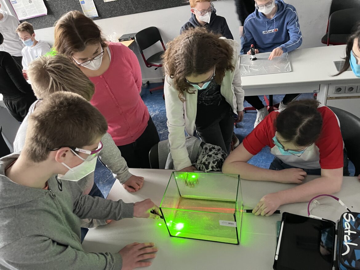 Referent Carsten Schultze hatte spannende Inhalte für die Schülerinnen und Schüler vorbereitet. So erforschten sie, wie groß der Anteil unterschiedlicher Lebensmittel an ihrem Wasser-Fußabdruck ist, experimentierten mit Lasern oder konnten versuchen, selbst eine Glasfaser zu ziehen.
