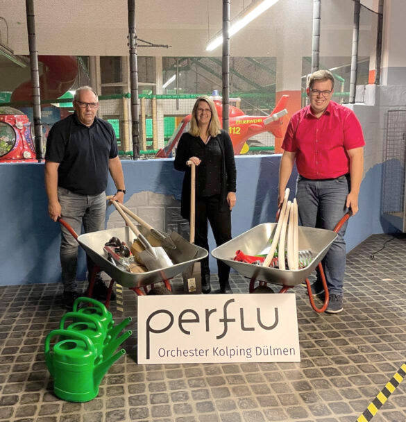 Dankbar nahm Markus Becker (links), der sich in Dülmen durch seine riesige Hilfsbereitschaft für die Opfer der Flutkatastrophe hervorgetan hat, eine Spende in Höhe von 500 Euro vom PerFlu-Orchester Kolping Dülmen (vertreten durch Yvonne Teutemacher und Christoph Richter) entgegen, die er sogleich einsetzte, um bei Holthöwer Werkzeuge wie Schaufeln, Gießkannen und Schubkarren für Gartentätigkeiten einzukaufen und mit ins Ahrtal zu nehmen. Empfänger soll die Sankt-Nikolaus-Schule in Kall sein.