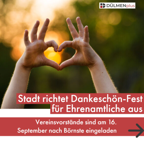 Anmeldungen zum Dankeschön-Fest sind bis zum 22. August möglich. Die Stadt bittet die Vereinsvorstände darum, die namentlichen Meldungen per E-Mail an ehrenamt@duelmen.de zu senden. Aufgrund der Vielzahl an Vereinen, Initiativen und ehrenamtlicher Gruppen in Dülmen sind die Anmeldungen pro Verein zunächst auf drei Personen begrenzt. Diese Zahl könne sich im Laufe der Anmeldezeit aber noch erhöhen – deshalb empfiehlt die Stadt, weitere Personen für eine „Warteliste“ zu nennen.