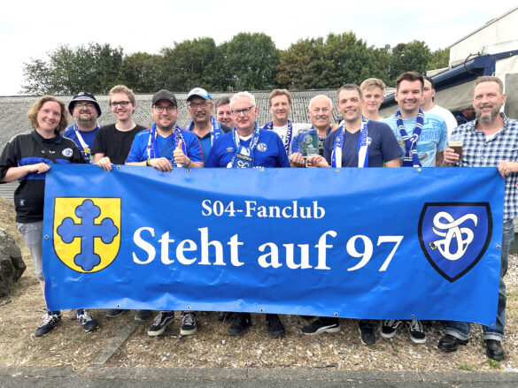 Dülmen. Vor dem Heimspiel gegen Union Berlin erfolgte Samstag in der Gaststätte des Schalke-Fanclub-Dachverbands „P7“, direkt vor der Osttribüne des Stadions, eine besondere Ehrung: Für seine 25-jährige Mitgliedschaft überreichten die Bezirkssprecher Melanie Illburger und Kalle Völkel dem 1997 gegründete Fanclub „Steht auf“ einen Glaspokal. Nach der Ehrung und dem gemeinsamen Austausch und Rückblick ging es dann zusammen ins Stadion.