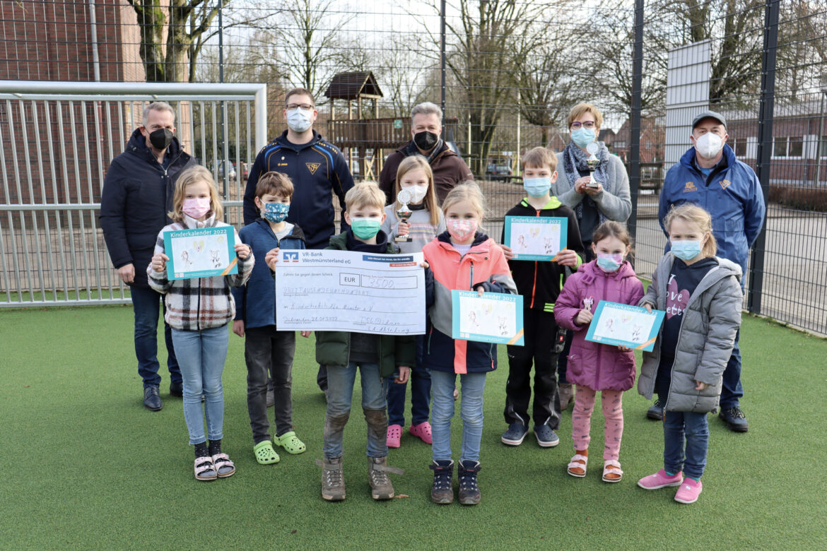 Dülmen. Zwar konnte der Nikolauslauf der TSG Dülmen auch 2021 nur in einer digitalen Version stattfinden, bei der die Teilnehmer*innen ihre Zeiten online eintragen konnten – mitgemacht haben aber dennoch 750 Laufbegeisterte. Besonders beeindruckend: Allein 350 der Teilnehmer*innen traten für den Schulverbund der Paul-Gerhardt-Schule/ Kardinal-von-Galen-Schule Merfeld an und stellten somit die mit Abstand größte Gruppe. Für diesen Einsatz überreichte Stephan Gerdemann, Leichtathletik-Abteilungsleiter der TSG Dülmen (hinten, zweite Person von links), gemeinsam mit Wolfgang Bleß (hinten, Mitte) und Franz-Josef Bayer-Eynck (hinten rechts) am Freitag Pokale an die Klassensprecher der Merfelder Grundschule und Schulleiterin Britta Sawicki (hinten, zweite Person von rechts), die diese stellvertretend für alle Teilnehmer*innen entgegennahmen. Durch den sportlichen Einsatz und die damit verbundenen Spenden kam darüber hinaus eine Spendensumme von 3.500 Euro zusammen, die im Anschluss an Rainer Schwital (hinten links) von der Kinderkrebshilfe Münster überreicht wurden, der diese dankend entgegennahm und den Schüler*innen erklärte, was mit dem Geld passieren wird: „Damit werden wir krebskranken Kindern eine Sporttherapie ermöglichen, damit die Betroffenen so viel Spaß wie möglich haben können. Danke für die Unterstützung!“