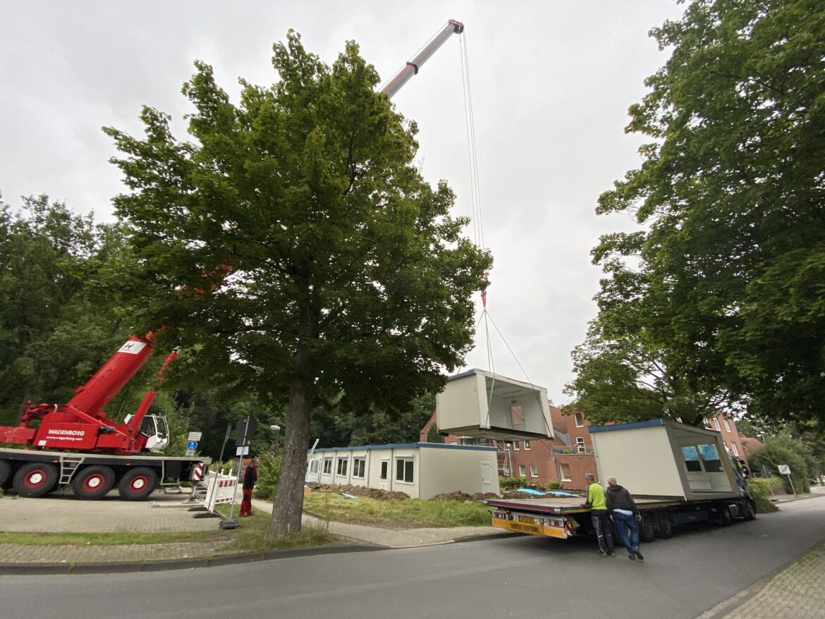 Dülmen. Ein großer Autokran und ein Tieflader waren in dieser Woche im Einsatz, um die Container am Vorpark abzutransportieren. In dem Übergangsquartier war für mehrere Jahre das Familienzentrum St. Anna-Kindergarten untergebracht, bevor es im vergangenen Jahr ins einsA eingezogen war. Seitdem stand die Raumersatzlösung im Vorpark leer. Die Container blieben zunächst, um sie bei Bedarf zum Start des Kindergartenjahres 2021/22 wieder belegen zu können. Dies war jedoch nicht nötig, da alle Kinder in anderen Einrichtungen untergebracht werden konnten.