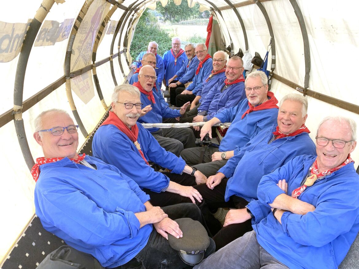 Buldern. Die Stimmung hier oben auf dem Planwagen ist prächtig: „Hoch auf dem gelben Wagen“ klingt aus den Kehlen der „Kiepenkerls“. Unterstützt vom Gitarren- und Akkordeonspiel, mit denen auch manch ein anderes Lied aus dem Repertoire der Mundorgel intoniert wird. Zu finden in einem eigenen Liederbuch der „Kiepenkerls“, die seit Jahrzehnten ihre Sparclub-Jahresfahrt als dreitägige Planwagenfahrt unternehmen.