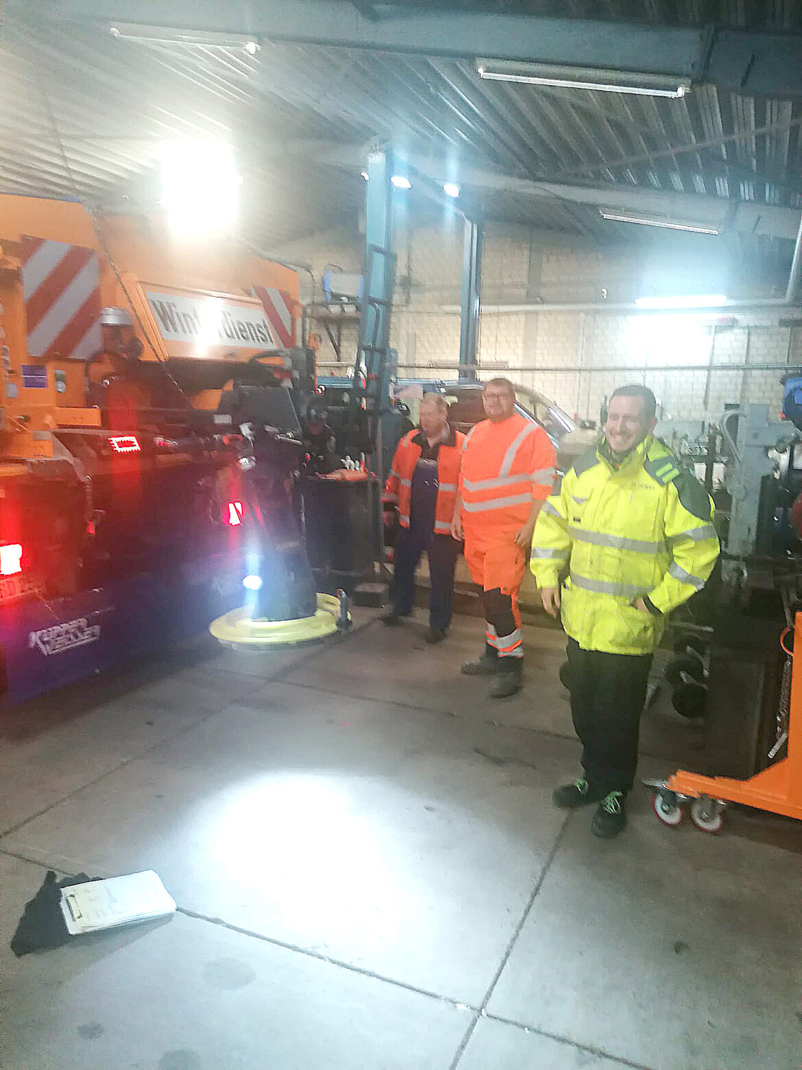 Damit alle Abläufe von Beginn an eingespielt sind, fand jetzt der zweitägige Testlauf statt. Bevor die Maschinen in Bewegung gesetzt wurden, stand erst einmal die Detail-Planung auf dem Programm: Routen ausarbeiten, Teams einteilen, Arbeitsvorgänge besprechen. „Ganz wichtig sind auch Fahr- und Sicherheitsschulungen. Immerhin fahren wir mit unseren Fahrzeugen über Straßen, die noch nicht geräumt und gestreut sind. Das ist nicht ungefährlich“, erläutert Christian Rohlmann. Der Theorie folgte der Praxiseinsatz: Alle Hauptrouten wurden abgefahren und dabei kontrolliert, ob die großen Fahrzeuge auch an engen Stellen gut durchkommen – oder ob Bäume und Äste noch zurückgeschnitten werden müssen. Ein unabhängiger Sicherheitsprüfer checkte zudem alle Fahrzeuge noch einmal gründlich durch.