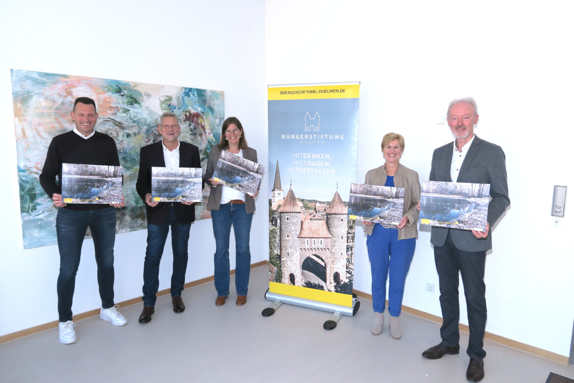 Dülmen. Seit Montag ist der neue Adventskalender der Bürgerstiftung Dülmen im Verkauf. Insgesamt 308 Preise im Gesamtwert von 15.600 Euro verbergen sich hinter den Kläppchen des Adventskalenders, den die Bürgerstiftung inzwischen zum zehnten Mal immer in der Voradventszeit im Angebot hat. „Über 100 Unternehmen und Einzelpersonen haben in diesem Jahr Preise beigesteuert – und wir haben in diesem Jahr noch deutlich mehr Preise als bisher entgegennehmen können. Daher haben wir auch die Auflage des Kalenders von 5.000 Exemplaren im vergangenen Jahr auf jetzt 5.500 Exemplare erhöht“, erklärte Heinz Klausdeinken, stellvertretender Vorsitzender der Bürgerstiftung Dülmen. Der Preis des Kalenders, dessen Titelbild von Jutta Reher im Dülmener Wildpark entstand, ist jedoch mit 5 Euro pro Stück auch jetzt bei der zehnten Auflage gleich gebleiben. Erhältlich ist der Adventskalender unter anderem bei Dülmen Marketing. Die Preise werden im Advent täglich neu auch im Internet bekannt gegeben. Das Foto zeigt von links Klaus Göckener (Vorstandsmitglied) und Berthold Büning (Vorsitzender) von der Bürgerstiftung, Sandra Allerdisse, Geschäftsleiterin des einsA, sowie Lisa Stremlau (Vorstandsmitglied) und Heinz Klausdeinken (stellvertretender Vorsitzender) von der Bürgerstiftung.